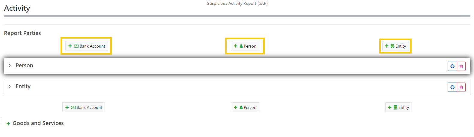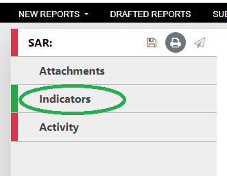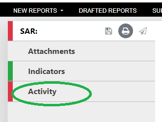 When the reporting party has selected one or more indicator codes for a SAR report, click on to Activity.