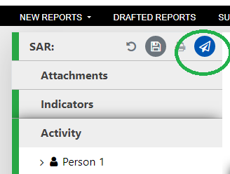 When the reporting party has completed the report and is ready to send it to FIA, all sections must be green, before you can click on the small paper airplane icon.